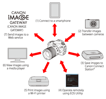 | Install Camera Connect on a smartphone | Install EOS Utility on a computer | ・Register with CANON iMAGE GATEWAY ・Register Web services on the camera | |||