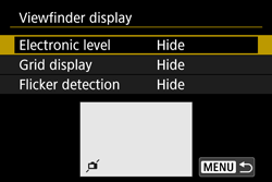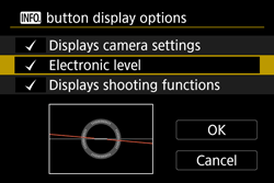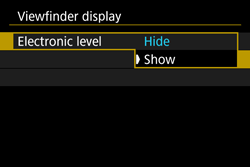 You can display the electronic level on the LCD monitor and in the viewfinder to help you correct camera tilt. Note that you can check only the horizontal tilt and not the forward/backward tilt.