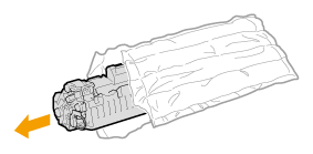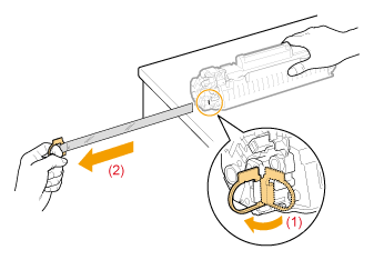 8. Place the toner cartridge on a flat surface, remove the tab, and gently pull the sealing tape completely out.