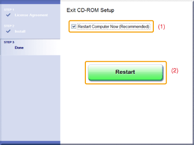 (1) Select the [Restart Computer Now (Recommended)] check box.