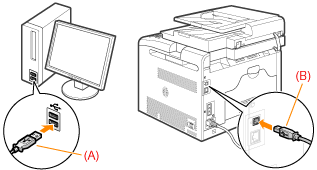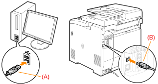 - Square end (B): Connect (B) to the USB port on the machine.