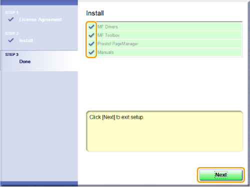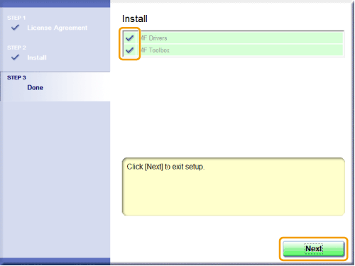 * The MF Toolbox cannot be installed on Windows 2000 Server/Server 2003/Server 2008 computers, or if the [MF Toolbox] check box is cleared in Step 4. Installation is skipped and proceed to Step 10.