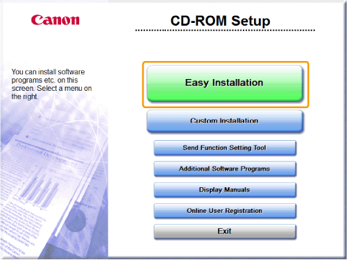 Choose [Easy Installation] for quick and easy installation. Choose [Custom Installation] to install the following application and manual.