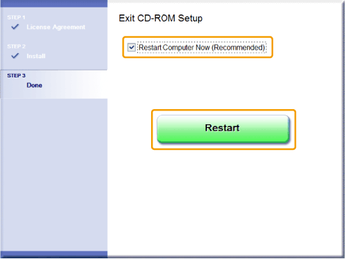 (1) Select the [Restart Computer Now (Recommended)] check box.