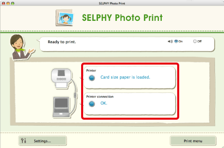 If the [Card size paper is loaded.] (If Card Size is selected) message appears in the [Printer] box, and [OK] in the [Printer connection] box, the printer and the computer are properly connected, and the printer is ready for printing.