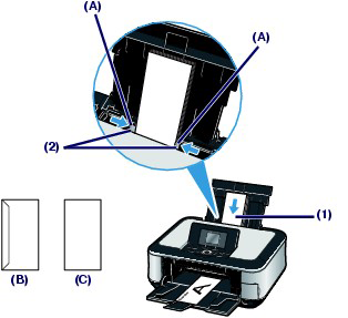 (1) Slide the Paper Guides (A) to open them, and load the envelopes in the center of the Rear Tray WITH THE ADDRESS SIDE FACING YOU.
