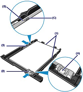 (1) Slide the Paper Guides (A) to open them, and load the paper in the center of the Rear Tray WITH THE PRINT SIDE FACING YOU.