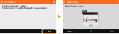 If a paper jams, ⋖Paper jammed.⋗ is displayed on the screen. Press ⋖Next⋗ () to display simple solutions. If it is difficult to understand the procedures on the display, see the following sections to clear jams.