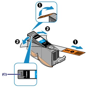 If the orange tape remains on the L-shape air hole (C), ink may splash or the machine may not print properly.