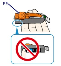 Do not touch the inside of the orange protective cap (D) or the open ink port (E). The ink may stain your hands if you touch them.