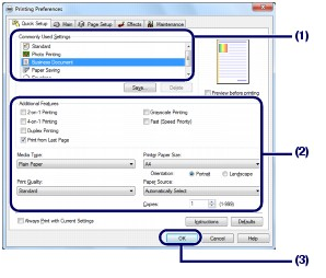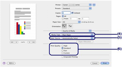 Here we make sure that [Plain Paper] in [Media Type], [Standard] in [Print Quality], [A4] in [Printer Paper Size], and [Automatically Select] in [Paper Source] are selected.