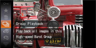 When playing back images, images taken in [High-speed Burst]() mode are displayed in a group with only the first image displayed, however, grouped images can also be viewed individually.
