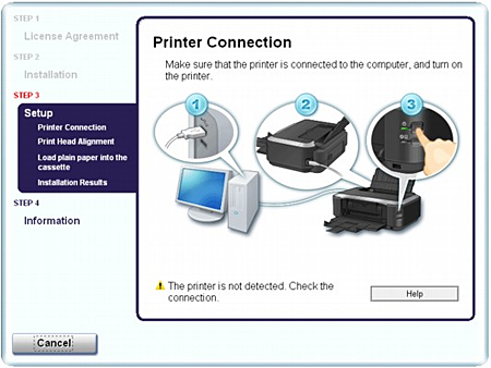 If you are unable to proceed beyond the Printer Connection screen, make sure that the USB cable is securely plugged into the USB port of the printer and is connected to the computer, and then follow the procedure below to reinstall the printer driver.