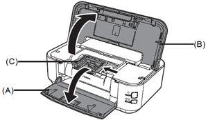 1. Open the Paper Output Tray (A) and the Top Cover (B).