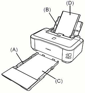 The Cassette (A) supports plain paper (C) only. To print Photo Paper/Hagaki (D), be sure to load it in the Rear Tray (B).