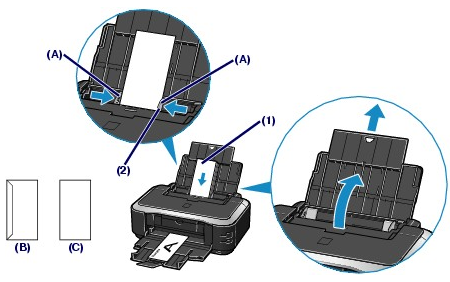 (1) Slide the Paper Guides (A) to open them, and load the envelopes in the center of the Rear Tray WITH THE ADDRESS SIDE FACING YOU.