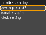 Select to automatically assign an IP address via DHCP protocol. When ⋖Auto Acquire: On⋗ is displayed, automatic addressing is enabled.