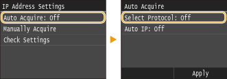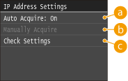 Select to configure the IP address settings by manually entering an IP address. In order to select this option, ⋖Auto Acquire⋗ must be set to ⋖Off⋗.