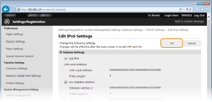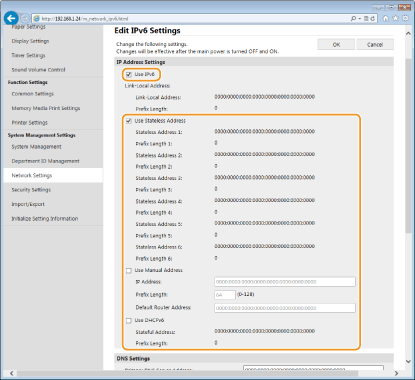 The IPv6 addresses of the machine can be configured via the Remote UI. Before setting IPv6 addresses, check the IPv4 address settings. You need to set the correct IPv4 settings to use IPv6 addresses. The machine can use up to nine of the following IPv6 addresses: