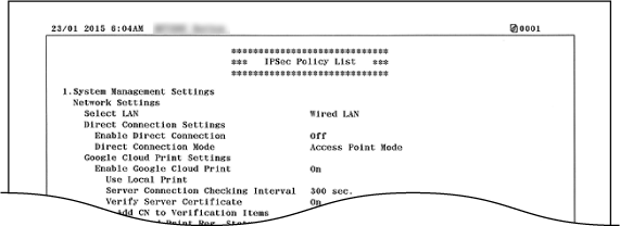 You can check the list of policy names and the IPSec settings registered in the machine by printing an IPSec Policy List.