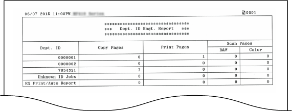 When Department ID Management is enabled, you can check the total volume of printouts for each ⋖Department ID⋗ by printing a Department ID Management Report. By checking the printout totals, you can better manage your paper and toner cartridge supplies.