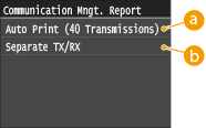 You can check the fax and e-mail logs of sent and received documents by printing a Communication Management Report. The report can be printed automatically after every 40 transmissions, or you can print it manually.