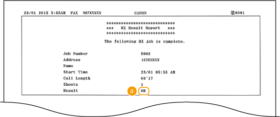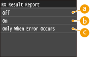 You can check the logs of received fax or I-Fax documents by printing an RX Result Report. The report can be printed either every time a transmission is completed or only when a receiving error occurs.