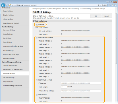 The IPv6 addresses of the machine can be configured via the Remote UI. Before setting IPv6 addresses, check the IPv4 address settings. You need to set the correct IPv4 settings to use IPv6 addresses. Note that the scan function that uses the scanner driver or MF Scan Utility is not available in an IPv6 environment. The machine can use up to nine of the following IPv6 addresses: