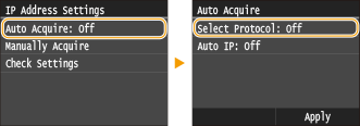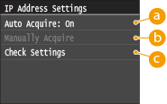 Select to configure the IP address settings by manually entering an IP address. In order to select this option, ⋖Auto Acquire⋗ must be set to ⋖Off⋗.