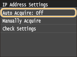 Select to automatically assign an IP address via DHCP protocol. When ⋖Auto Acquire: On⋗ is displayed, automatic addressing is enabled.