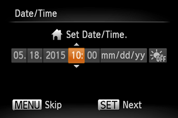 Set the current date and time correctly as follows if the [Date/Time] screen is displayed when you turn the camera on. Information you specify this way is recorded in image properties when you shoot, and it is used when you manage images by shooting date or print images showing the date. You can also add a date stamp to shots, if you wish.