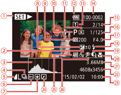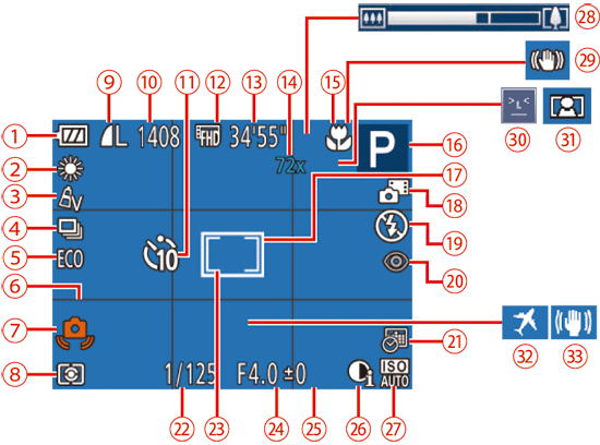 | Histogram | Shutter speed (still images), Image quality / Frame rate (movies) | ||