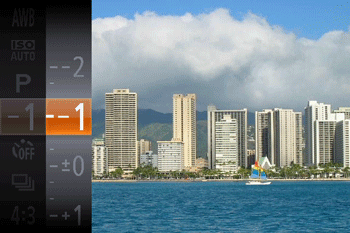 The standard exposure set by the camera can be adjusted in 1/3-stop increments, in a range of –2 to +2.