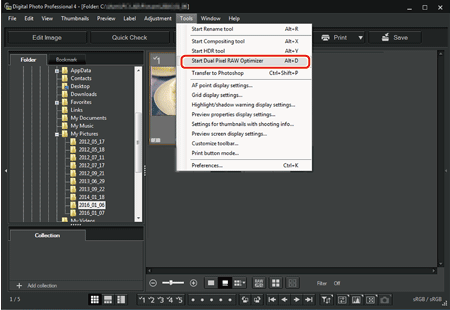 1. In the main window or edit image window, select the Dual Pixel RAW image you want to adjust, and then select [Start Dual Pixel RAW Optimizer] from the [Tools] menu.