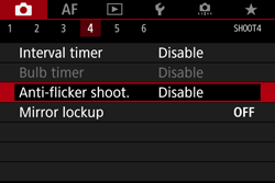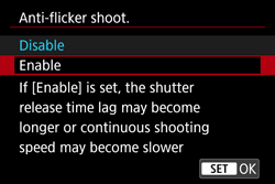 When [Enable] is set and you shoot under a flickering light source, the shutter-release time lag may become longer. Also, the continuous shooting speed may become slower, and the shooting interval may become irregular.