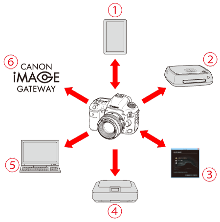 | Install Camera Connect on a smartphone | Install EOS Utility on a computer | Set up a computer as an FTP server | ・Register with CANON iMAGE GATEWAY | ||