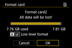 You can stop the low-level formatting by selecting [Cancel]. Even in this case, normal formatting will be completed and you can use the SD card as usual.