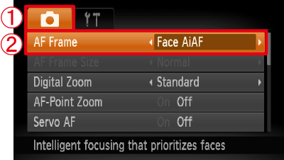 Operate the ⋖directional buttons⋗ to set [AF Frame] to [Face AiAF].