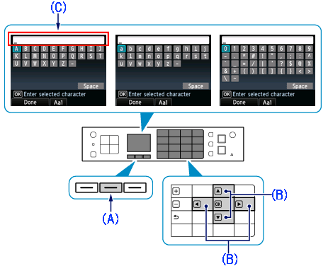 (2) Use the buttons (B) to select a character from the on-screen keyboard, then press the OK button to enter it.