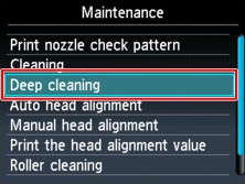 If print quality does not improve by the standard cleaning of the print head, clean the print head deeply. Cleaning the print head deeply consumes more ink than the standard cleaning of the print head, so clean the print head deeply only when necessary.