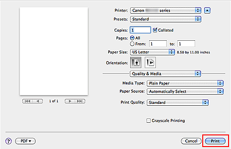 Click Print. When you execute print, the document will be printed in accordance with the type and size of the media.