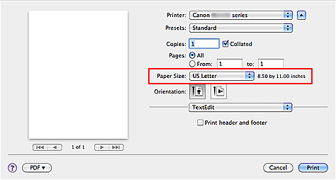 For Paper Size, select the paper size to be used. If necessary, set the number of copies, the pages to be printed, and the orientation.