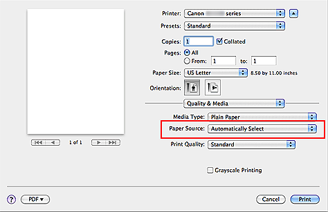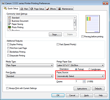 Select Automatically Select, Rear Tray, Cassette, Continuous Autofeed, or Paper Allocation that matches your purpose for Paper Source.