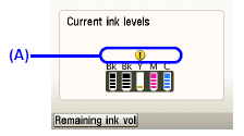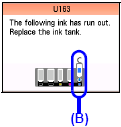 | Ink has run out. See“The following ink has run out. Replace the ink tank.”and take appropriate action. (B) Empty ink tank. |