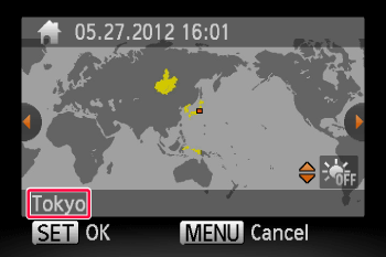 Operate the ⋖ directional buttons ⋗ left and right to select the home time zone ([Tokyo] is selected in the above image).