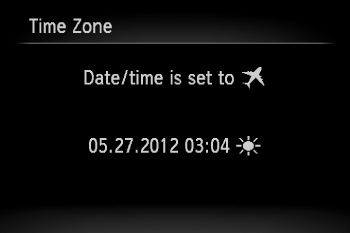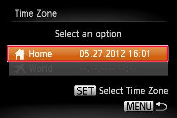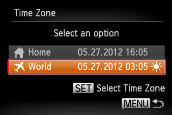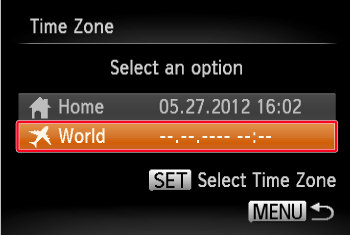 If [World] () appears on the screen, [Time Zone] is set to the world time zone.