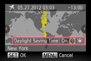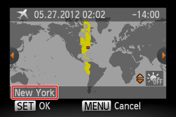 Operate the ⋖ directional buttons ⋗ left and right to select the world time zone ([New York] is selected in the above image).
