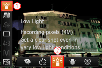 Operate the ⋖directional buttons⋗ left or right to select [Shooting mode]. (The [Low Light] (