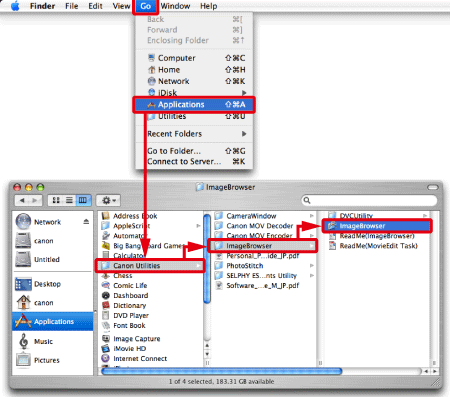 If you do not see the [ImageBrowser] icon in [Dock], click [Go] in the menu bar, select [Applications] -⋗ [Canon Utilities] -⋗ [ImageBrowser], and then click [ImageBrowser] to start the software.