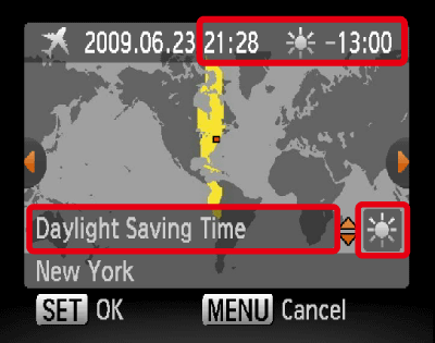 When traveling abroad, you can record images in local dates and times simply by switching the time zone setting to any of the destination time zones that you have already pre-registered.
